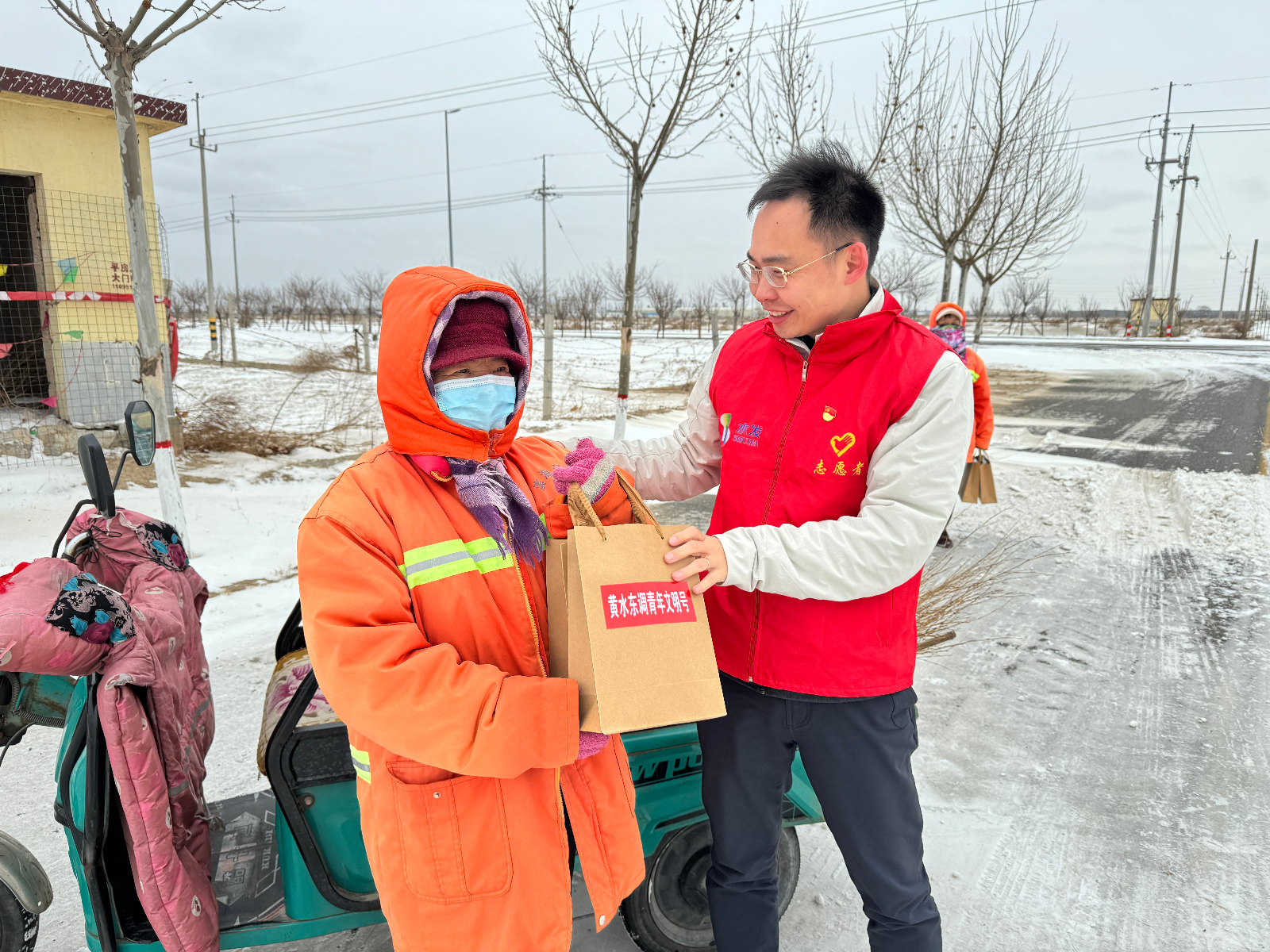 環(huán)衛(wèi)工人是生活中最平凡的人,也是最不可或缺的人。他們每天踏著晨曦去,披星戴月歸,冒酷暑頂嚴(yán)寒,始終戰(zhàn)斗在保障環(huán)境衛(wèi)生工作的第一線。青年志愿者準(zhǔn)備了溫暖的手套和美味元宵,送到環(huán)衛(wèi)工人手中,同時(shí)也送上了元宵節(jié)的祝福,感謝他們對(duì)城市環(huán)境所做出的貢獻(xiàn),希望他們?cè)诔醮褐懈惺艿揭环轀嘏?/span>